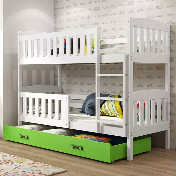 Das BMS KUBUŚ Etagenbett ist die perfekte Lösung für junge Wohnräume, das Design und Funktionalität ideal vereint. Mit einer Liegefläche von 90x200 cm und einer ansprechenden Farbkombination aus Weiß und Grün bietet es sowohl Stil als auch Komfort. Das Bett kommt zusammen mit zwei komfortablen und hypoallergenen Matratzen sowie einem praktischen Stauraum in Form einer Schublade.