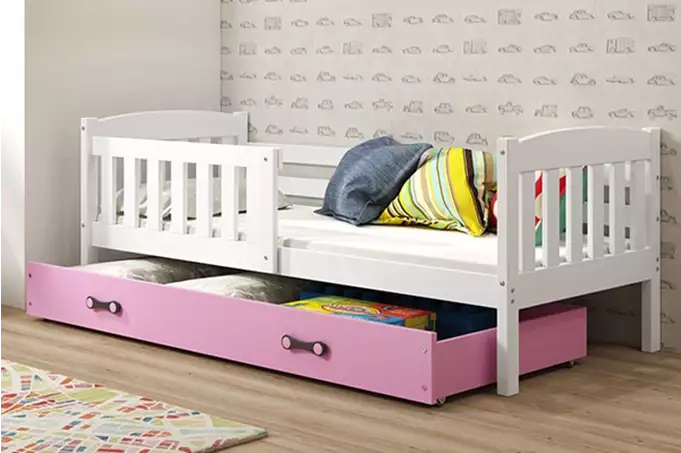 BMS | Jugendbett KUBUŚ | 90x200 cm | Mit Matratze und Schublade | Weiß/Pink