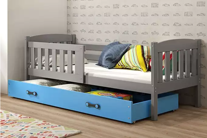 BMS | Einzelbett KUBUŚ | 90x200 cm mit Schublade, Graphit/Blau