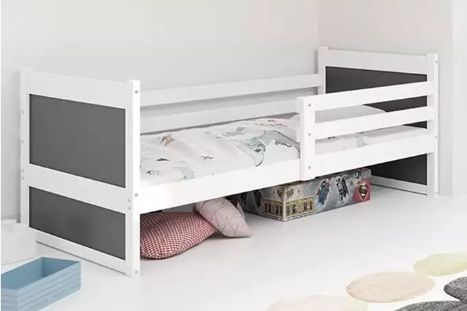 Die Abmessungen des BMS RICO Bettes betragen 90x190 cm, ideal für Jugendliche. Das Bettgestell ist aus stabilen Kiefernholz gefertigt, während die MDF-Platte ebenfalls mit einer schützenden Lackierung versehen ist. Die Matratze hat eine Gesamtdicke von 7 cm und ist mit einem hypoallergenen, quilted Bezug aus Polyester mit Reißverschluss ausgestattet.