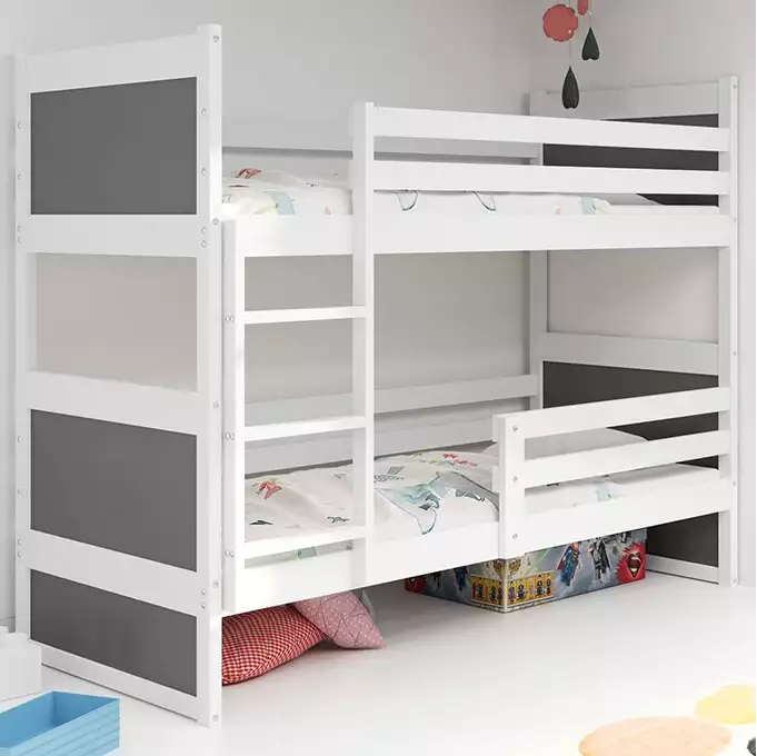 Dieses Jugendbett eignet sich ideal für Kinder- und Jugendzimmer, wobei der moderne Look und die praktischen Eigenschaften den Bedürfnissen wachsenden Kids gerecht werden. Die zwei Matratzen mit abnehmbarem Bezug erleichtern die Reinigung und Pflege und bieten besonderen Komfort, während das Bett gleichzeitig sicher und robust ist.