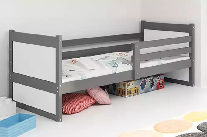 Das BMS RICO Bett verfügt über einen speziellen Federeinsatz aus Birkenholz, der durch ein innovatives Click-Clack-System schnell montiert werden kann. Das Bett ist mit einem PVC-Halter auf einer Metallstrebe montiert, was zusätzliche Stabilität bietet. Sein modernes Design in Graphit und Weiß fügt sich harmonisch in jedes Jugendzimmer ein.