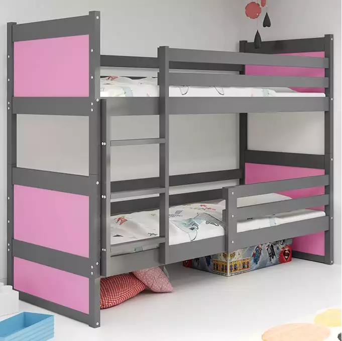 Dieses Etagenbett ist ideal für Geschwister oder Übernachtungsgäste. Es passt in moderne Kinderzimmer und jede Art von Einrichtung. Die bestehende Farbgebung in Graphit und Pink lässt sich außerdem hervorragend mit anderen Möbelstücken kombinieren und verleiht dem Raum einen frischen, lebendigen Look. Zudem kann es problemlos an unterschiedlichen Standorten aufgestellt werden, ohne an Stabilität zu verlieren.