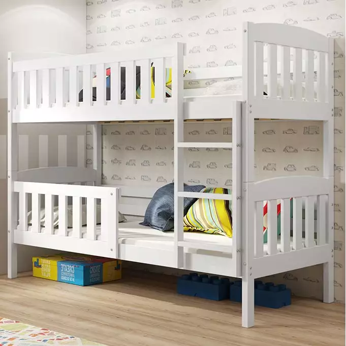 Das Etagenbett hat eine Liegefläche von 90 x 190 cm und ist aus erstklassigem Kiefernholz hergestellt. Der spezielle Lattenrahmen aus flexiblen Birkenholzlatten sorgt für zusätzlichen Komfort und ist dank des praktischen Click-Clack-Systems einfach zu montieren und zu demontieren. Die Rundungen des Bettes sind so gestaltet, dass sie sicher und komfortabel sind (Radius R2).