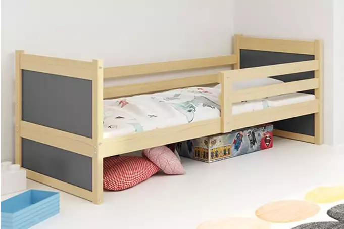 Das Bett hat eine Größe von 90x200 cm und ist aus robustem Kiefernholz gefertigt. Die Oberfläche besteht aus einer MDF-Platte, die mit wasserbasiertem Lack behandelt wurde, was sowohl umweltfreundlich als auch gesundheitlich unbedenklich ist. Der Bettrahmen ist so konzipiert, dass er eine maximale Belastung von bis zu 100 kg aushält, was es ideal für Jugendliche macht.