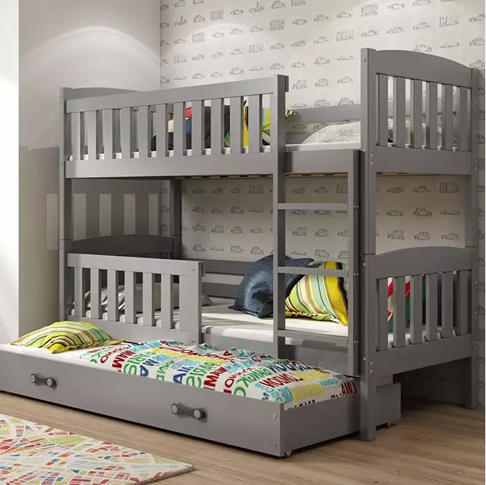 Das Bett hat die Maße 90x190 cm und bietet eine stabile Basis mit einem maximalen Gewicht von bis zu 100 kg pro Ebene. Die Federleisten aus hochwertigem Birkenholz sorgen nicht nur für eine optimale Unterstützung der Matratze, sondern auch für eine gute Luftzirkulation. Die Schublade aus laminierten Spanplatten bietet zusätzlichen Stauraum oder die Möglichkeit für eine weitere Schlafgelegenheit.