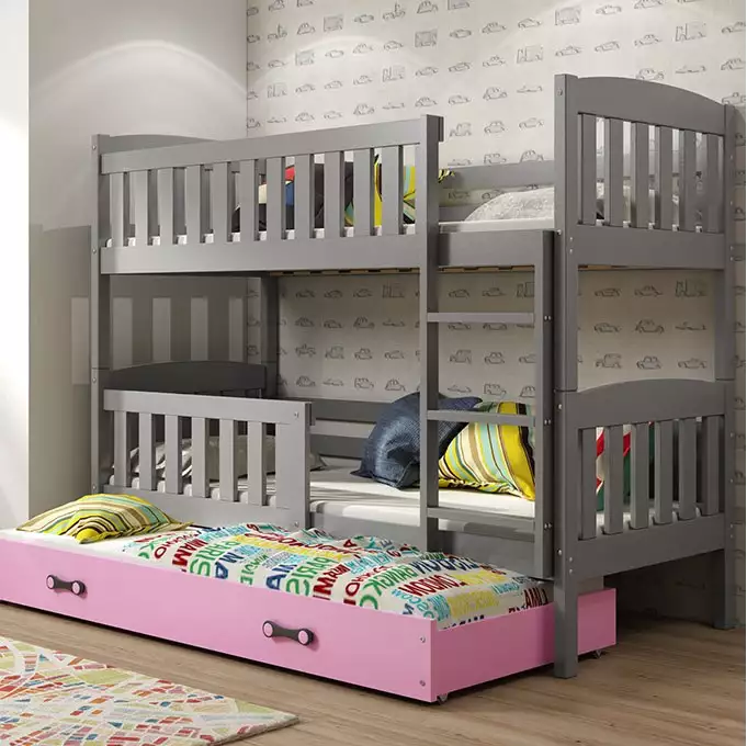 Das innovative Klick-Klack-System ermöglicht eine schnelle und unkomplizierte Montage des Bettes. Zudem bietet die integrierte Schublade eine praktische Möglichkeit, zusätzlichen Schlafplatz zu schaffen oder Bettwäsche zu verstauen. Das moderne Design in Graphit und Pink fügt sich harmonisch in jedes Jugendzimmer ein.