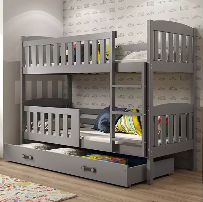 Dieses Etagenbett eignet sich hervorragend für Kinderzimmer oder Jugendzimmer und bietet nicht nur Schlafplatz, sondern auch eine praktische Schublade zur Aufbewahrung von Bettwäsche oder Spielzeug. Dank seines modernen Designs fügt es sich harmonisch in verschiedene Raumkonzepte ein und ist sowohl funktionell als auch ästhetisch ansprechend.