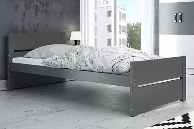 Das Bett ist 90 cm breit und 200 cm lang, was es ideal für Jugendliche macht. Der Bettrahmen besteht aus hochwertigem Kiefernholz, das mit umweltfreundlichem, wasserbasiertem Lack behandelt wurde. Dies gewährleistet nicht nur Langlebigkeit, sondern auch eine sichere Nutzung.