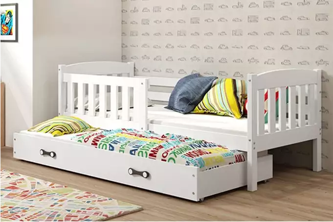 Das Bett hat die Standardgröße von 90x190 cm und besteht aus robustem Kiefernholz, das mit einer umweltfreundlichen, wasserbasierten Lackierung versehen ist. Die Matratzen haben eine Größe von 190x90 cm und 180x80 cm und sind mit einem hypoallergenen, quilted Polyesterbezug ausgestattet, der jederzeit abgenommen und gewaschen werden kann.