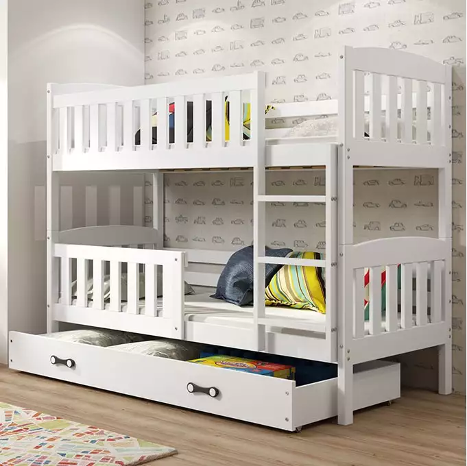 Das BMS KUBUŚ Jugend Etagenbett eignet sich ideal für Geschwister oder für das Kinderzimmer, in dem Freunde übernachten. Mit einer maximalen Tragfähigkeit von 100 kg pro Ebene erfüllt es alle Anforderungen an Sicherheit und Komfort. Die abgerundeten Kanten (Radius R2) sorgen dafür, dass das Bett auch in der Nutzung besonders kinderfreundlich ist.