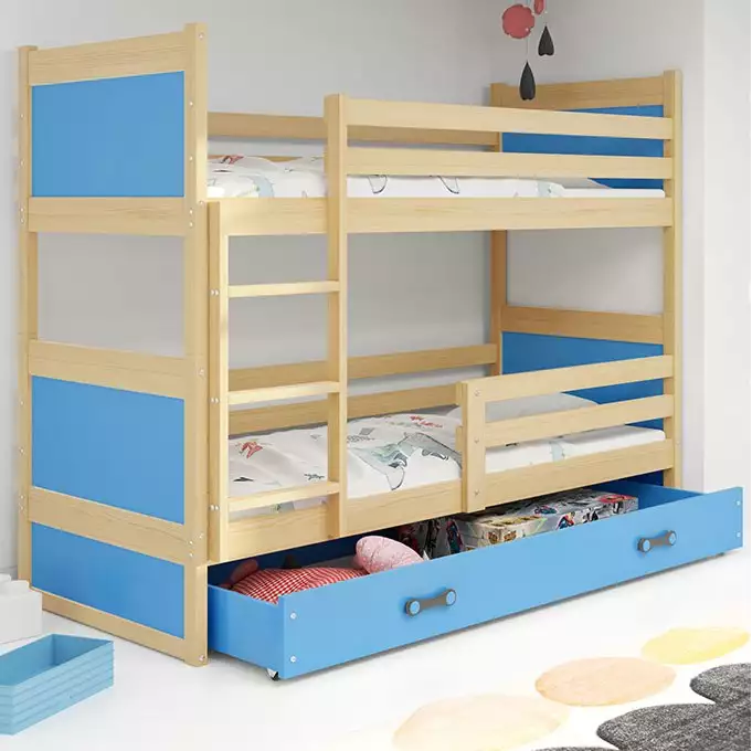 BMS | Jugend Etagenbett | 90x200 cm | Mit Matratze und Schublade | Kiefer/Blau