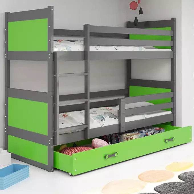 Das Design des Etagenbettes ist modern und zeitgemäß; es passt zu einer Vielzahl von Einrichtungsstilen. Der Rahmen aus Federleisten bietet eine anatomisch geeignete Unterstützung für die Matratzen, während das Click-Clack-System die Montage erheblich vereinfacht. Die Schublade ist ideal, um Spielzeug, Kleidung oder Bettwäsche ordentlich zu verstauen und ermöglicht somit eine effiziente Raumnutzung.