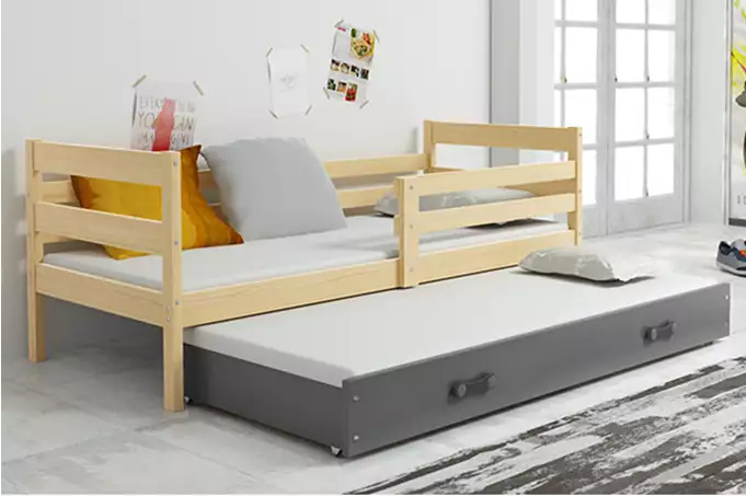 Das Design des Bettes verbindet Funktionalität mit ansprechendem Aussehen. Die einzigartige Kombination aus einer soliden Holzstruktur und der praktischen Schublade sorgt für zusätzlichen Stauraum und eine zusätzliche Schlafmöglichkeit. Das click-clack-System ermöglicht eine kinderleichte Montage der Federleisten ohne komplizierte Anleitungen.