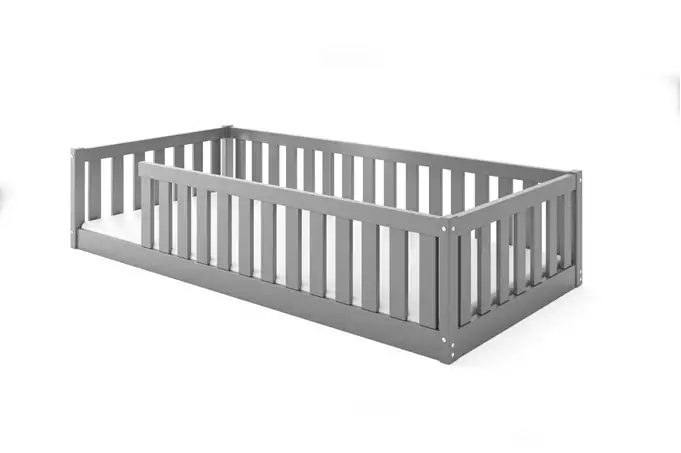 Das einseitige Design des Bettes ermöglicht eine einfache Anpassung an verschiedene Raumkonfigurationen. Die Barriere auf der rechten Seite schützt das Kind vor dem Herausfallen und sorgt für sichere Nächte. Das schlichte und elegante Design in Graphit-Optik passt perfekt zu jeder Kinderzimmereinrichtung.