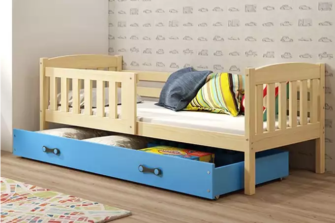 BMS | Jugendbett KUBUŚ | 90x190 cm mit Matratze und Schublade in Kiefer/Blau