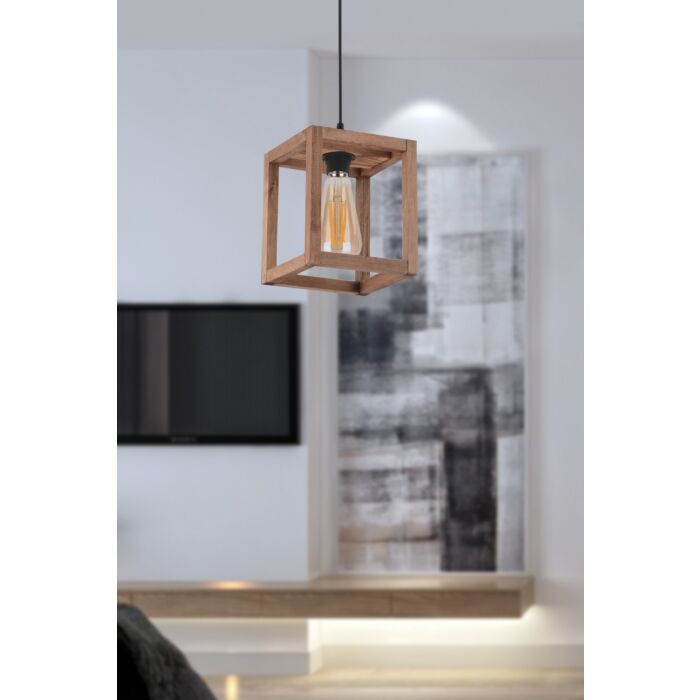Der Kronleuchter hat eine Kappenbreite von 16 x 16 cm und eine Gesamthöhe von 60 cm. Mit einer Höhe der Kappe von 19 cm und einer verstellbaren Kabeloption, lässt er sich flexibel und nach Ihren Wünschen installieren. Die schöne braune Farbe des Holzes verleiht dem Raum einen warmen Akzent.
