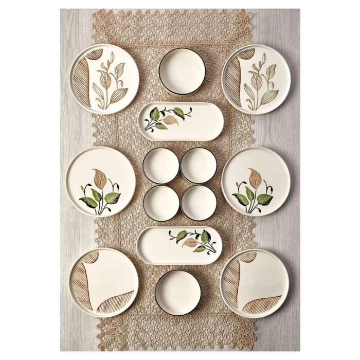 Das Set enthält insgesamt 14 Teile: 6 Teller von 19 cm Durchmesser, 2 große Schalen mit den Maßen 25 x 11 x 3,5 cm und 6 kleine Schalen mit 10,5 x 10,5 x 3,5 cm (150 ml). Jedes Stück ist aus 100% Keramik gefertigt und sorgt für eine luxuriöse und qualitativ hochwertige Tischkultur.