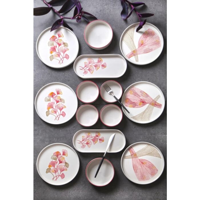 Deze set bevat 6 borden met een diameter van 19 cm, 2 schalen van 25 x 11 x 3,5 cm en 6 kommen van 10,5 x 10,5 x 3,5 cm met een inhoud van 150 ml. Alle items zijn gemaakt van 100% keramiek, wat zorgt voor duurzaamheid en een luxe uitstraling.