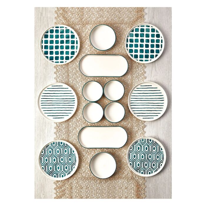 De set omvat diverse items: 6 borden van 19 cm, 6 kommen van 10,5 x 10,5 x 3,5 cm met een capaciteit van 150 ml en 2 schalen van 25 x 11 x 3,5 cm. Gemaakt van 100% keramiek, biedt het een duurzame en luxe uitstraling.