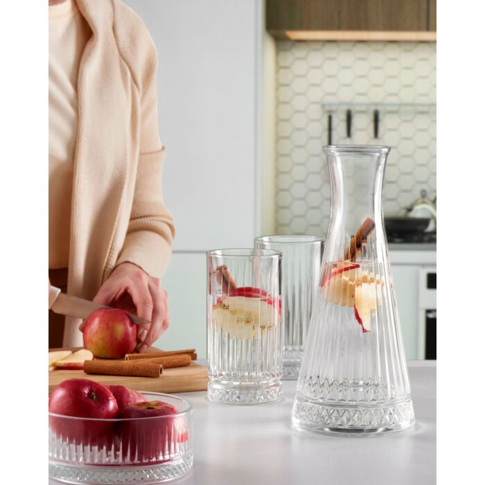Diese vielseitige Flasche ist perfekt für das Servieren von Wasser, Saft oder sogar Wein und fügt jedem Anlass eine elegante Note hinzu. Das transparente Design hebt die lebendigen Farben Ihrer Getränke hervor, wodurch sie noch einladender wirken.