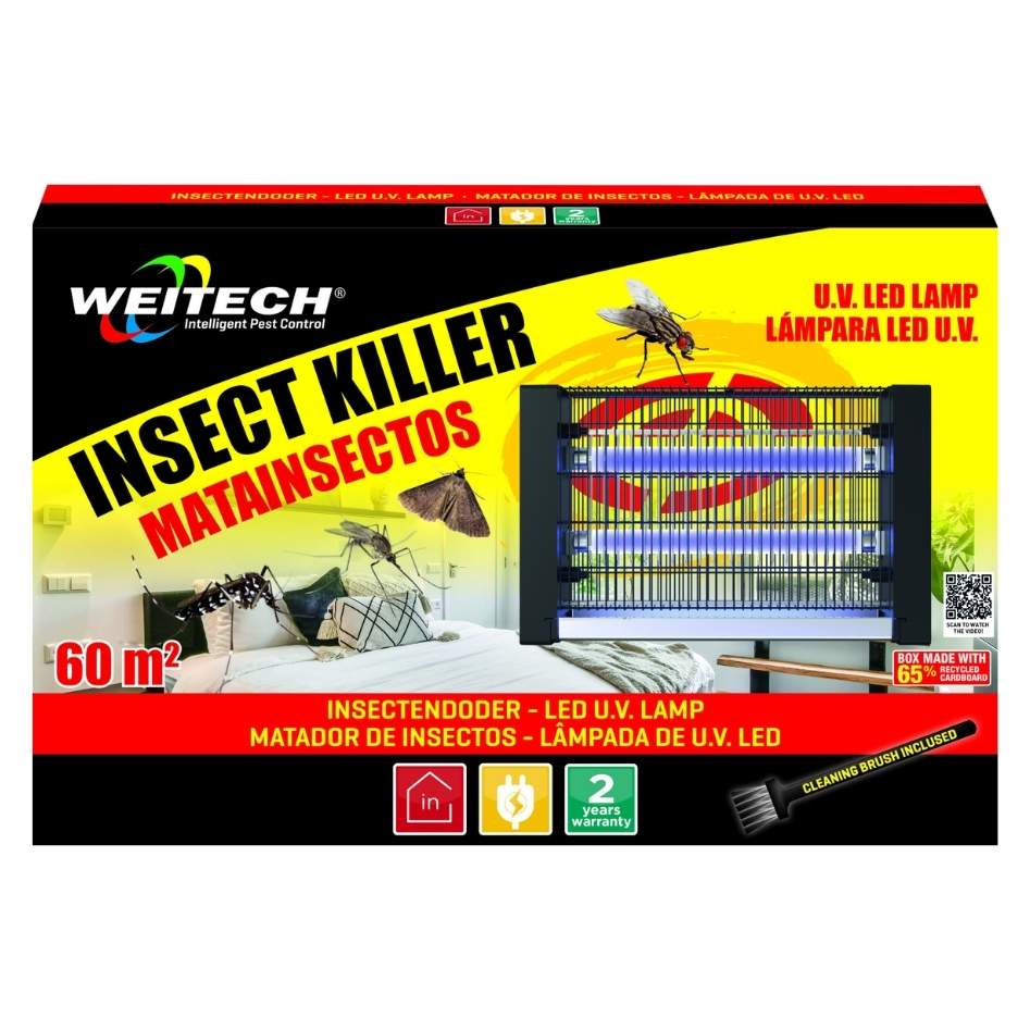 Die Weitech Insectenlampe ist so konzipiert, dass sie eine effektive Reichweite von bis zu 60 m² bietet. Ihr schockbeständiges Design gewährleistet, dass das Gerät sicher in der Nähe von Kindern und Haustieren eingesetzt werden kann. Hergestellt aus langlebigen Materialien, bietet sie eine robuste und zuverlässige Nutzung.