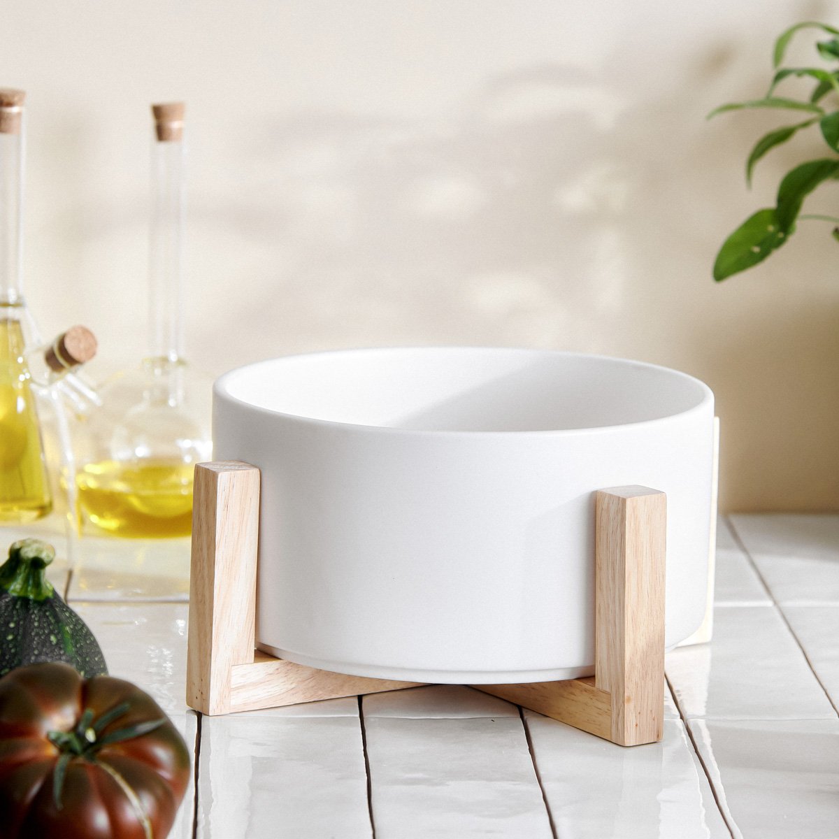 Die Kombination aus der eleganten weißen Keramik und dem natürlichen Holz sorgt für einen modernen Look, der zu verschiedenen Einrichtungsstilen wie skandinavisch, boho und modern passt. Diese Schüssel ist funktional und verleiht jedem Essbereich eine harmonische Note.