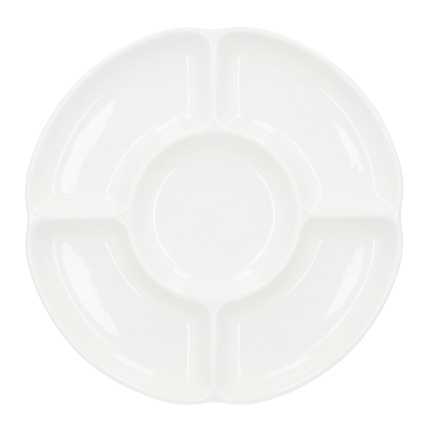 Der Platter hat einen Durchmesser von 30 cm und ist in fünf Sektionen unterteilt, die es ermöglichen, verschiedene kleine Köstlichkeiten ansprechend zu präsentieren. Hergestellt aus weißem Porzellan, bietet er eine dezente und elegante Grundlage für Ihre Speisen, die sich harmonisch in jede Tischgestaltung einfügt.