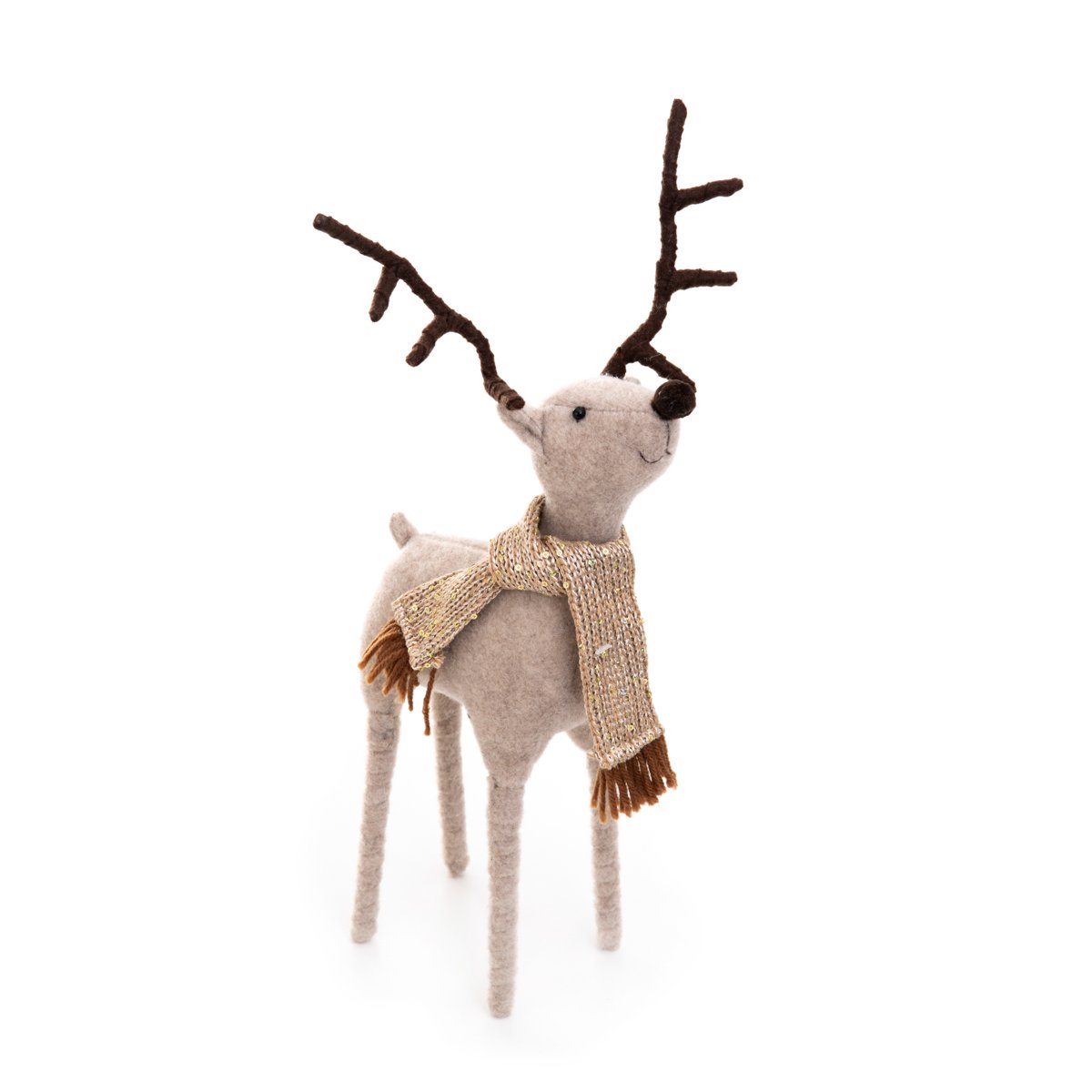 Das stehende Rentier besteht vollständig aus Polyester. Es ist weich und angenehm zu berühren.