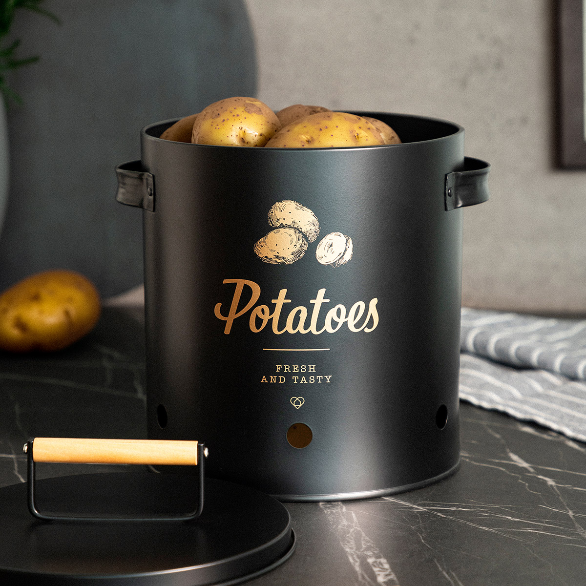 Der YENNIS-Behälter ist für die Lagerung von Kartoffeln konzipiert, kann jedoch auch für andere Gemüse verwendet werden, die einen dunklen und kühlen Ort benötigen. Der Behälter ist schwarz und mit goldenen Grafiken sowie einer Aufschrift dekoriert, die seinen Inhalt angibt. Er eignet sich ideal für den Einsatz in der Küche, im Keller oder in der Speisekammer.