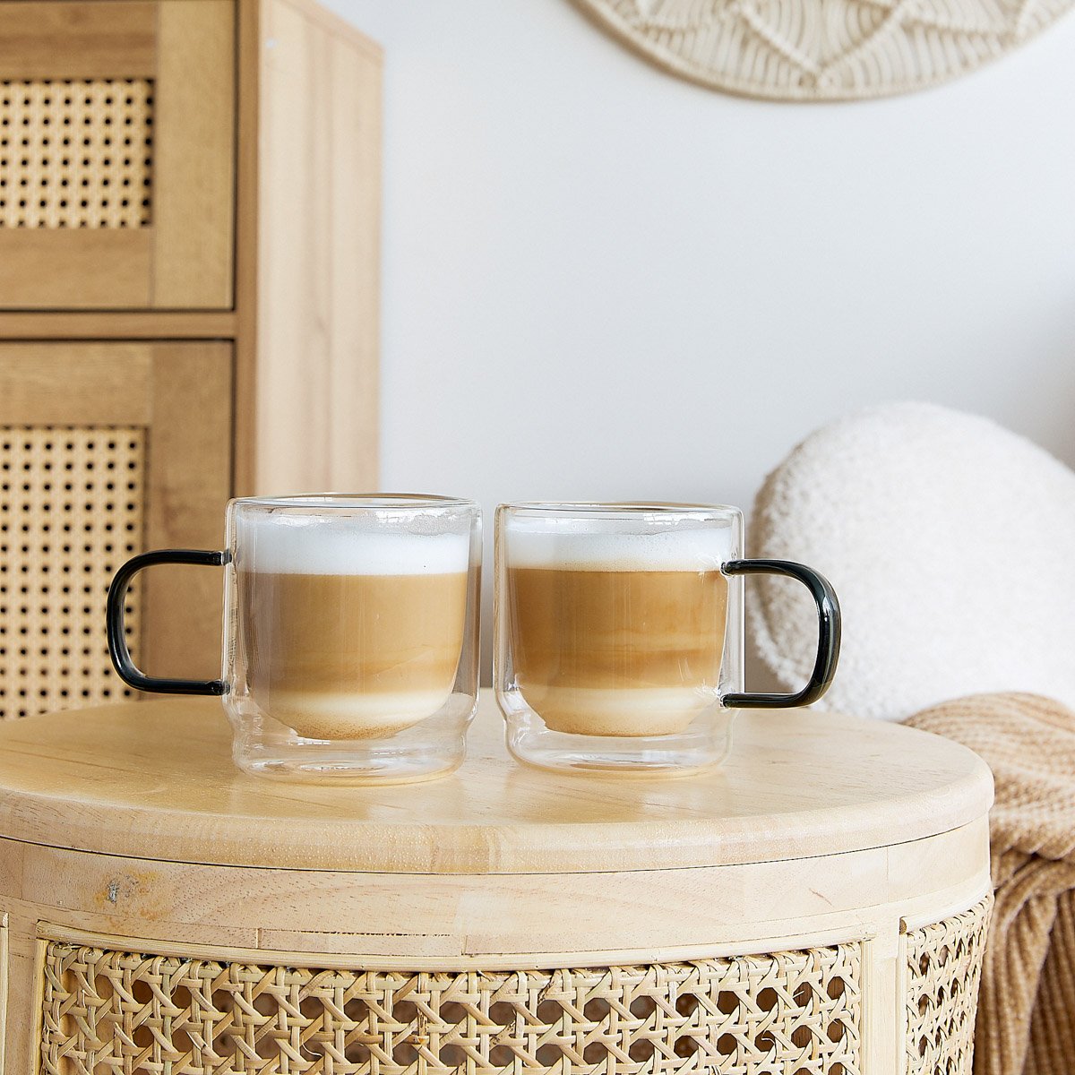 Genießen Sie einen entspannten Moment mit einem aromatischen Kaffee, serviert in den eleganten CEMBRA RETRO Thermogläsern. Im Paket finden Sie 2 Gläser aus transparentem, glänzendem Glas, das jedes Getränk in seinem vollen Glanz zur Geltung bringt. Sie sind perfekt für ein Gespräch mit Freunden, für den morgendlichen Kaffee mit Ihrem Partner oder für entspannende Abende mit einer guten Serie. Ein heißes Getränk wärmt sanft die Wände, sodass Sie sich an das Glas kuscheln können, um sich nach einem Spaziergang aufzuwärmen und schnell Ihre Hände zu wärmen.