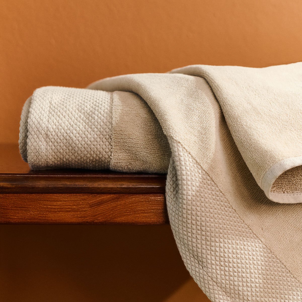 Das BOWIE Handtuch, gefertigt aus hochwertiger Baumwolle, zeichnet sich durch seine unvergleichliche Weichheit und hervorragende Saugfähigkeit aus. Die Velour-Textur verleiht ihm einen einzigartigen, sanften Glanz, der, zusammen mit der klassischen beige Farbe, einen Hauch von subtiler Eleganz und Wärme in jedes Badezimmer bringt.