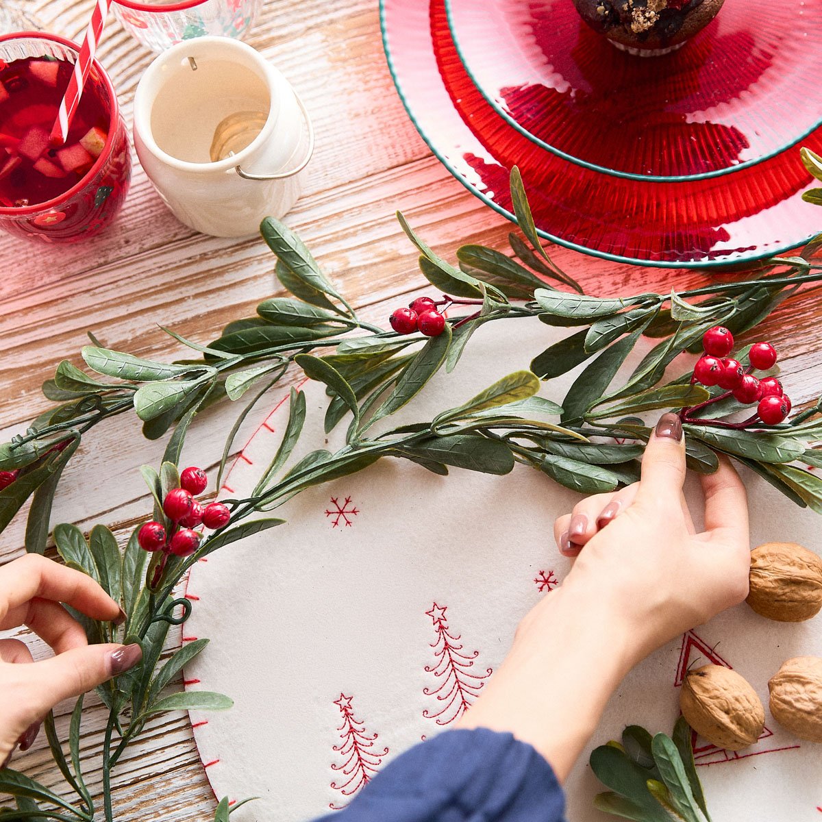 Die Weihnachtsdekoration von HOMLA ist die perfekte Möglichkeit, um Ihrem Zuhause während der festlichen Jahreszeit einen charmanten und natürlichen Akzent zu verleihen. Hergestellt aus realistisch aussehenden grünen Zweigen und verziert mit kleinen roten Beeren, ähnelt sie traditionellen Winterpflanzen und kann leicht in eine Vielzahl von Arrangements integriert werden, sei es als Girlande auf Kaminen oder als Tisch- oder Fensterdekoration.