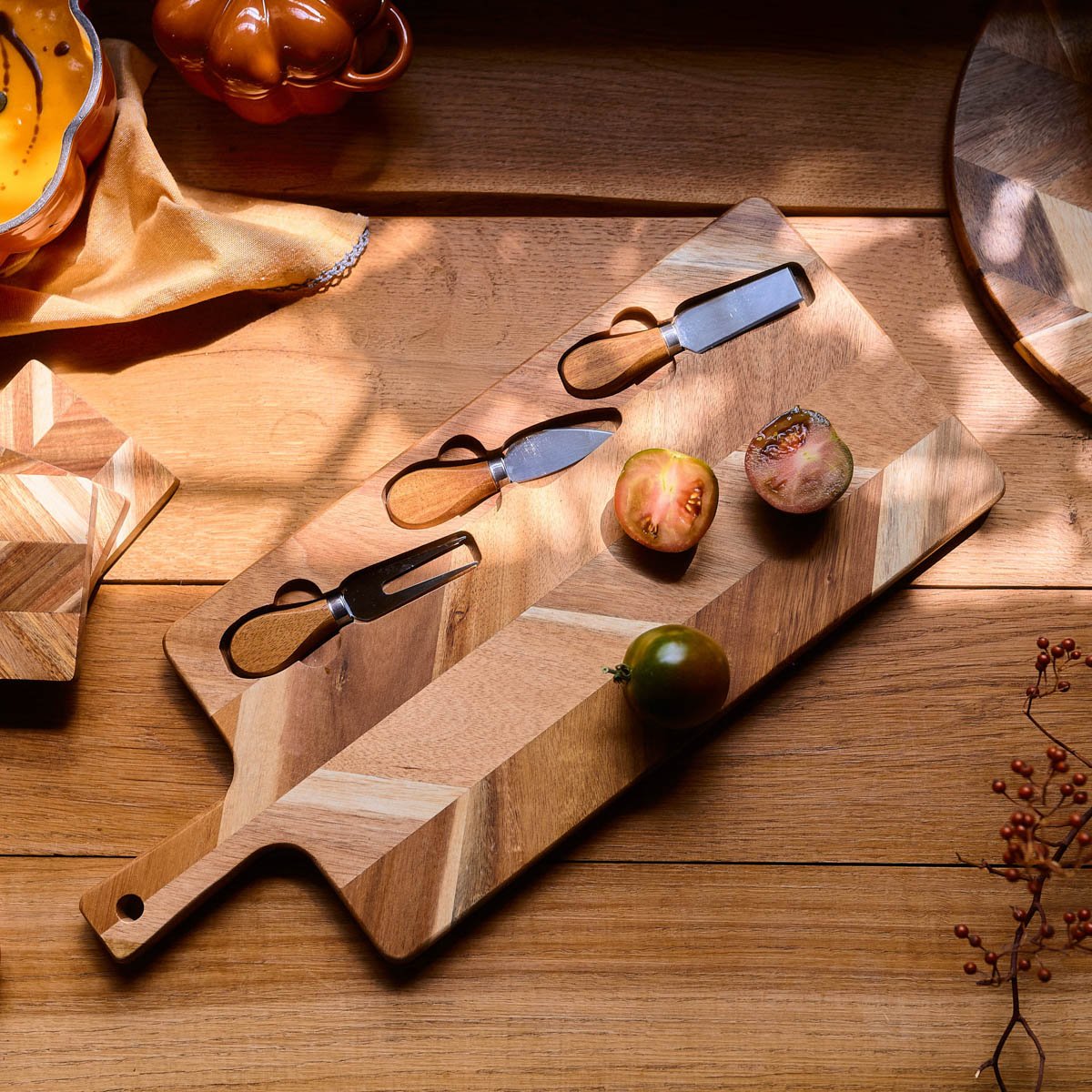 Das Brett ist aus naturbelassenem Holz gefertigt, während die Zubehörteile aus hochwertigem Edelstahl mit Holzgriffen bestehen. Die Abmessungen des Brettes betragen 48 x 20 cm, was es ideal für verschiedene Anlässe macht.
