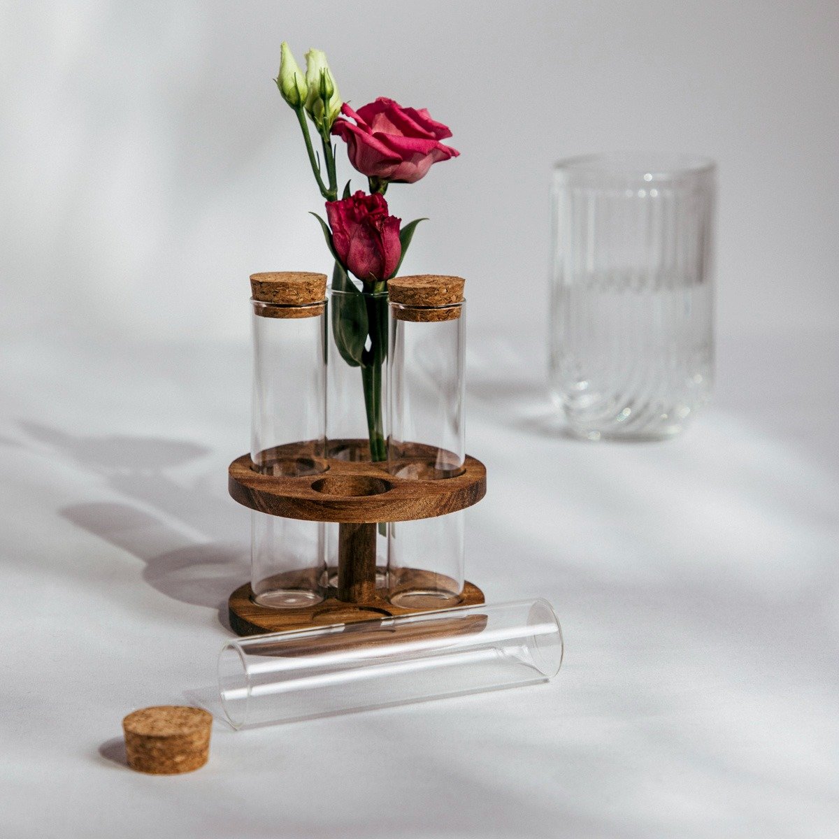 Die Behälter bestehen aus hochwertigem Glas, das es den Gewürzen ermöglicht, frisch zu bleiben. Der Stopfen sorgt für eine luftdichte Versiegelung und der Holzständer trägt zur Eleganz und Haltbarkeit des gesamten Sets bei.