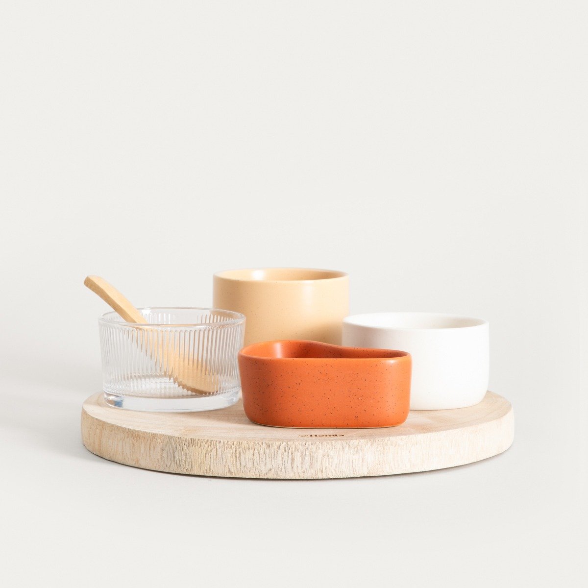 Das GRENADA Set besteht aus hochwertigen, langlebigen Materialien, die resistent gegen Beschädigungen sind. Die Schalen haben folgende Abmessungen: 1x Keramikschale (11×7 cm), 1x Keramikschale (9.5×5 cm), 1x Keramikschale (11×7×4 cm), 1x Glasschale (9.5×5 cm) und ein Holztablett mit einem Durchmesser von 26 cm und einer Höhe von 2 cm. Zudem enthält das Set einen Bambuslöffel mit einer Länge von 12 cm.