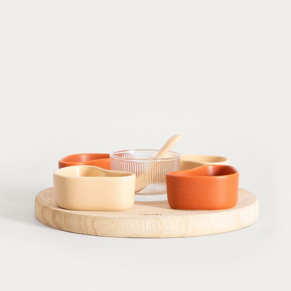 Für eine stilvolle Präsentation von Snacks ist das GRENADA Serving Set die praktische und elegante Lösung, die jedem Festmahl Charme verleiht. Die keramischen Schalen in warmen Erdtönen harmonieren perfekt mit der Glas-Schale und dem Holzlöffel. Zusammen werden sie auf einem runden Untersetzer stilvoll präsentiert, wodurch ein stimmiges und ästhetisch ansprechendes Set entsteht.