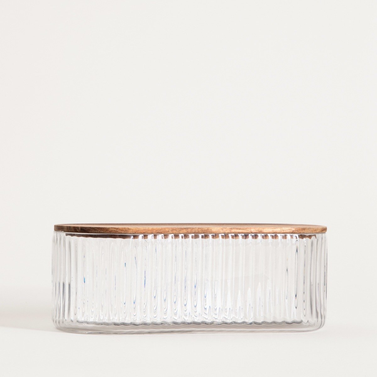 Der Container misst 26 x 12 cm und besteht aus hochwertigem Glas und Akazienholz. Die Glasteile sind spülmaschinenfest. Nicht für die Mikrowelle geeignet. Die maximale sichere Temperatur für die Verwendung beträgt 60°C.