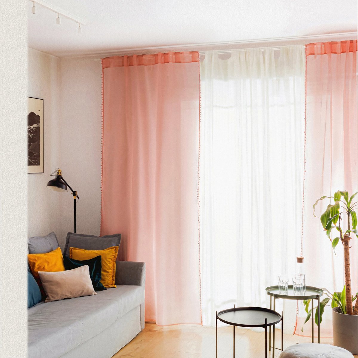 Der luftige HOMLA ADI Vorhang verleiht Ihrem Interieur eine subtile und charmante Note. In einem zarten Rosa gehalten, sind die Seiten mit kleinen Pompoms dekoriert. Beim Aufhängen im Fenster lässt er das Sonnenlicht perfekt diffundieren und bietet gleichzeitig Privatsphäre, wodurch eine angenehme Atmosphäre im Raum entsteht.