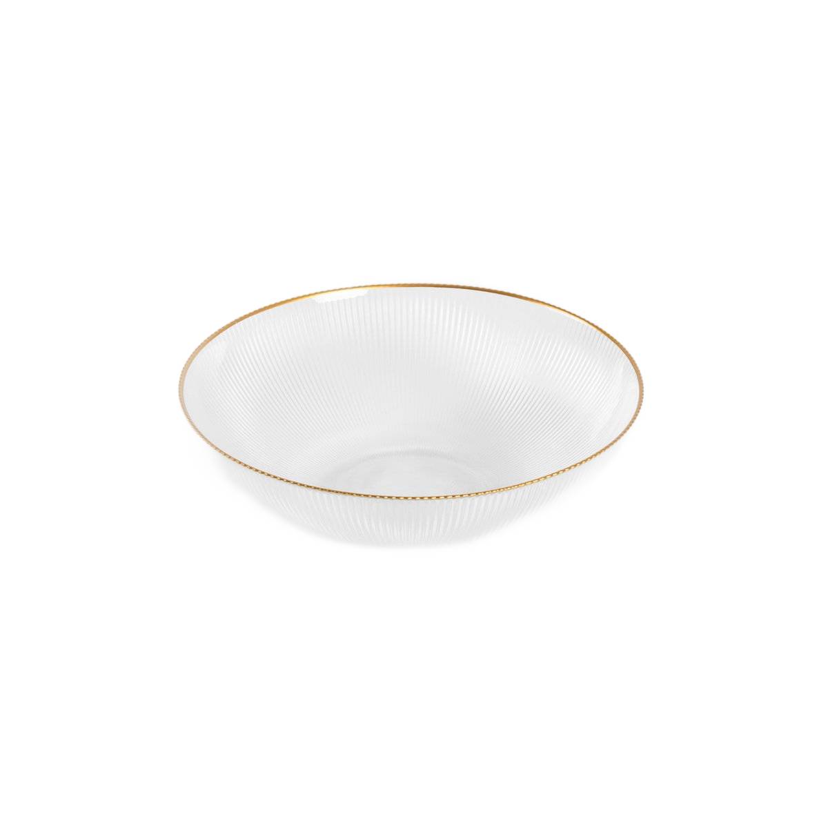 Verbessern Sie die Eleganz Ihres Tisches mit der großen LYNN Schale. Ihr subtil geripptes Design und der goldene Rand verleihen jedem Gericht einen einzigartigen Stil. Die transparente Oberfläche trägt zur Leichtigkeit bei, und ihre große Größe macht sie ideal für die Servierung von Salaten, Obst oder Snacks bei größeren Zusammenkünften.