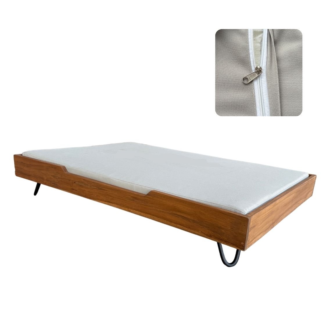 Das Hunde-Bett ist in zwei Größen erhältlich, was es passend für Hunde jeder Größe macht. Hergestellt aus hochwertigem und langlebigem Teakholz, bietet es eine auffällige Kombination aus Stil und Funktionalität. Die Materialien sorgen dafür, dass das Bett über viele Jahre hinweg erhalten bleibt und dem täglichen Gebrauch standhält.