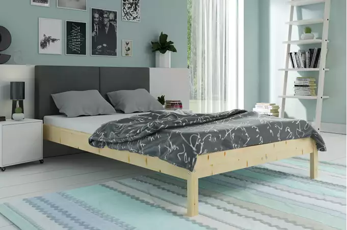 Das Bett hat die Abmessungen 140x200 cm und ist aus hochwertigem Kiefernholz gefertigt. Die unbeschichtete Oberfläche verleiht dem Bett einen rustikalen Charme. Das Kopfteil ist gepolstert und in einem eleganten Graphitgrau gehalten, was für einen modernen Akzent im Schlafzimmer sorgt.