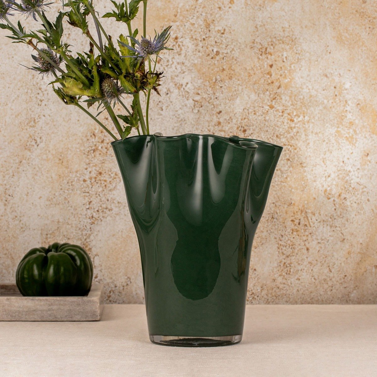 Die JUNE-Vase ist eine einzigartige Dekoration, die mit ihrer künstlerischen Form und der intensiven grünen Farbe sofort ins Auge fällt. Der gewellte Rand verleiht ihr eine Leichtigkeit, die sie zur idealen Ergänzung für modern gestaltete Innenräume macht. Sie fügt sich mühelos in jede Umgebung ein und bereichert jeden Raum auf stilvolle Weise.