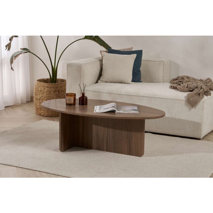 Het slanke en moderne ontwerp van deze salontafel past perfect in elke hedendaagse interieurstijl. De rijke walnootkleur en het strakke lijnen spel creëren een harmonieuze uitstraling die uitnodigt tot ontspanning en gezelligheid. De tafel biedt voldoende ruimte voor decoraties, boeken, en dagelijkse benodigdheden.