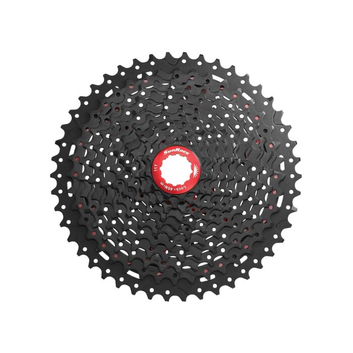 Die Sunrace CSMX8 bietet eine nahtlose Schaltperformance mit 11 Gängen und ist so konzipiert, dass sie eine zuverlässige und effiziente Kraftübertragung gewährleistet. Das ansprechende Design in Schwarz mit roten Akzenten verleiht der Kasette einen modernen Look, der sich harmonisch in jedes Fahrrad integriert.