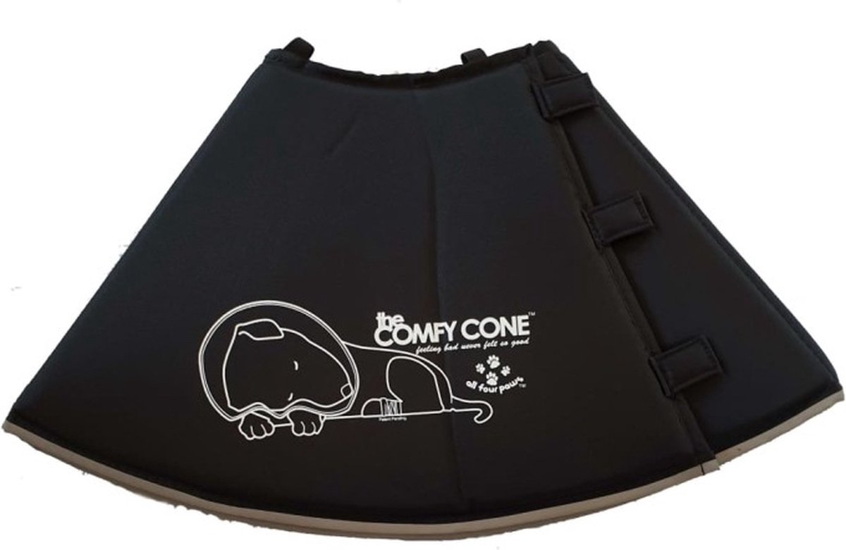 Der Comfy Cone in Schwarz ist eine innovative Hundekappe, die speziell entwickelt wurde, um Ihrem Hund Schutz zu bieten, während er sich von Verletzungen, Operationen oder Hautirritationen erholen muss. Die Kappe ist von Tierärzten getestet und hat sich bei den meisten ängstlichen und aggressiven Hunden bewährt. Dank der einzigartigen Konstruktion bietet der Comfy Cone ausreichend Halt, um ein Herausnehmen oder Zerbeißen zu verhindern.