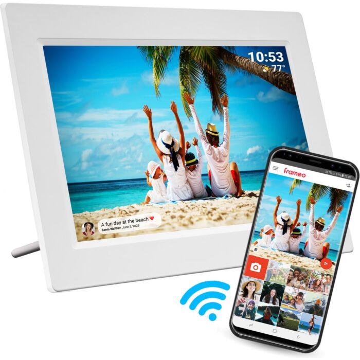 Der Bilderrahmen misst 25,4 cm in der diagonalen Bildschirmgröße. Er ist kompakt genug, um auf einem Tisch oder Regal platziert zu werden, und sein Gehäuse besteht aus hochwertigem, robustem Material, das gleichzeitig ästhetisch ansprechend ist.