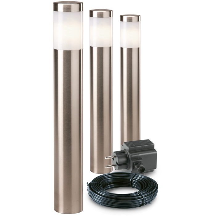 Das Albus Set ist aus hochwertigem Edelstahl gefertigt, was nicht nur für eine elegante Optik sorgt, sondern auch eine lange Lebensdauer und Widerstandsfähigkeit gegen Witterungseinflüsse garantiert. Die Maße von 410 cm Höhe, 60 cm Breite und 60 cm Tiefe stellen sicher, dass die Leuchten sowohl in kleinen als auch in großen Gärten gut zur Geltung kommen.