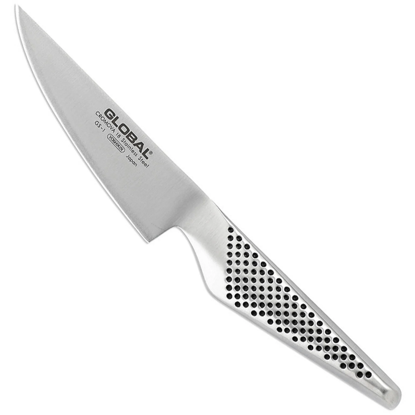 Die Klinge des Global Küchenmessers GS-1 misst 11 cm und besteht aus hochwertigem, rostfreiem Stahl, der eine langanhaltende Schärfe und Korrosionsbeständigkeit gewährleistet. Der ergonomische Griff ist aus Edelstahl gefertigt, was für eine hervorragende Stabilität und Handhabung sorgt.