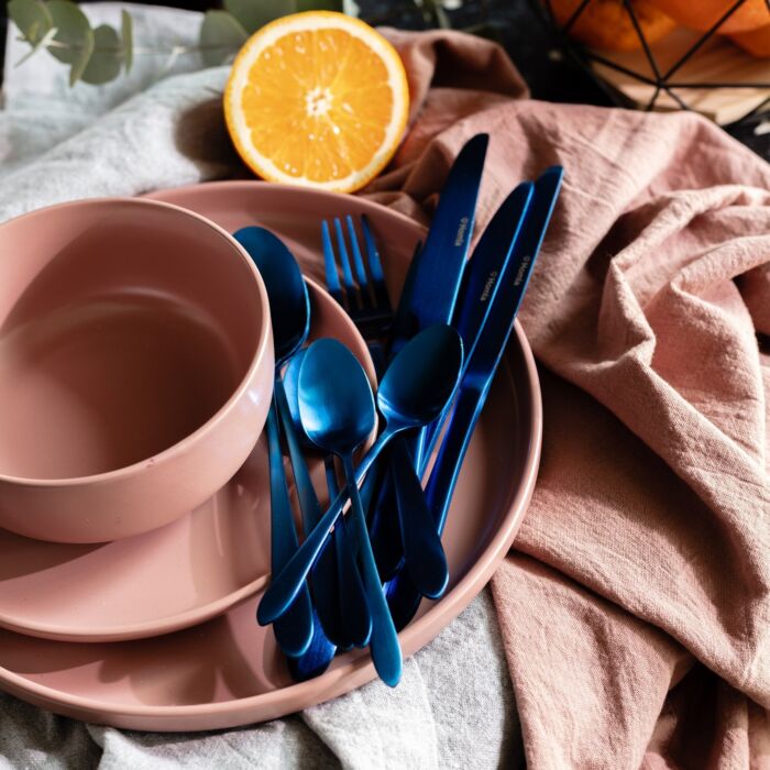 Dieses moderne Besteckset ist aus hochwertigem Edelstahl gefertigt und in Marineblau beschichtet. Der Edelstahl ist hygienisch, geruchsneutral und sorgt dafür, dass Ihre Speisen unverfälscht bleiben. Pflegeleicht und sauber, ist dieses Besteck eine stilvolle Ergänzung für Ihre Tischkultur. Handwäsche wird empfohlen, um die Farbe und den Glanz des Sets zu erhalten.